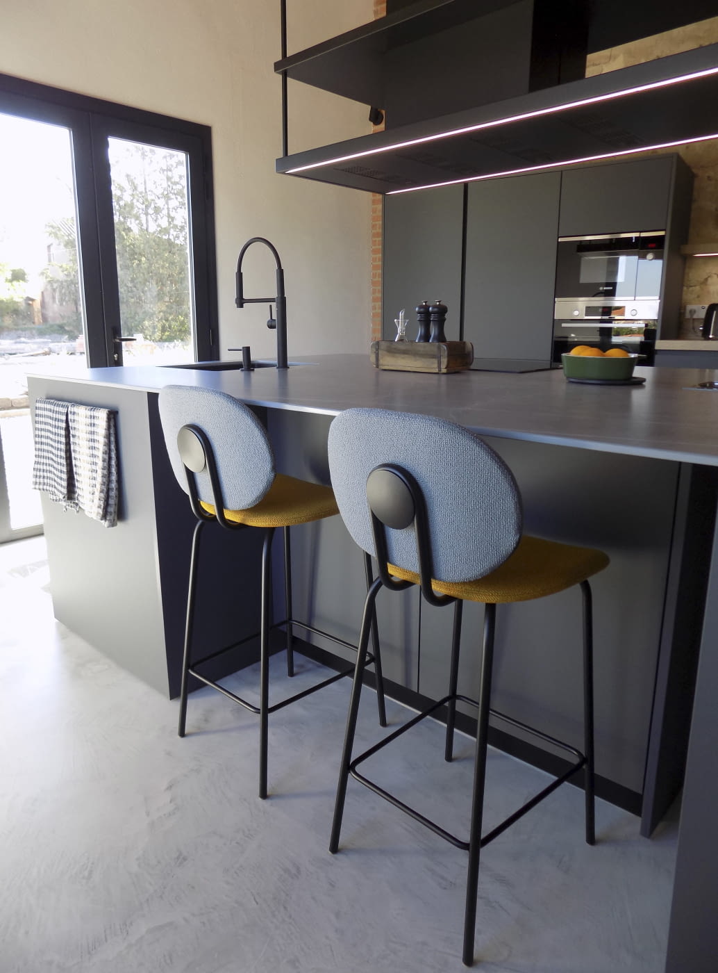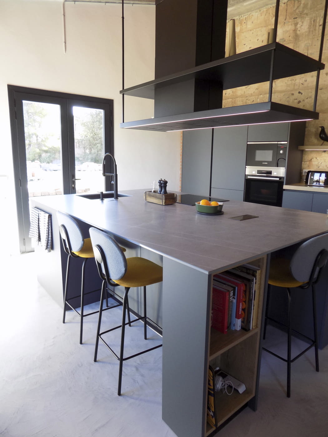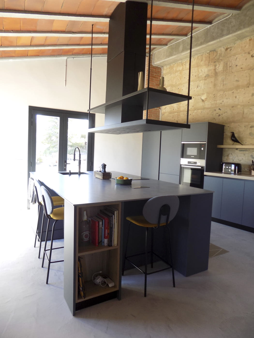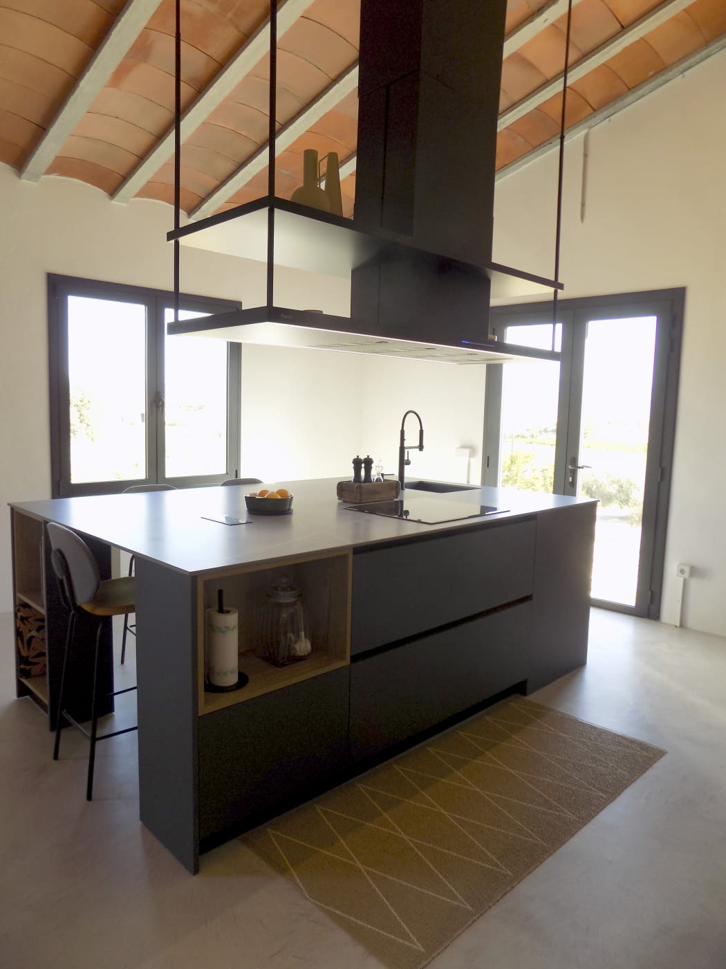 Este proyecto de cocina abierta destaca por su integración armónica con el resto de ambientes, combinando funcionalidad y estilo en un espacio moderno y acogedor. El diseño del mobiliario, fabricado íntegramente en acabado Fenix antracita, ofrece un acabado mate de alta resistencia y elegancia, con tiradores gola de color negro que refuerzan la estética minimalista.