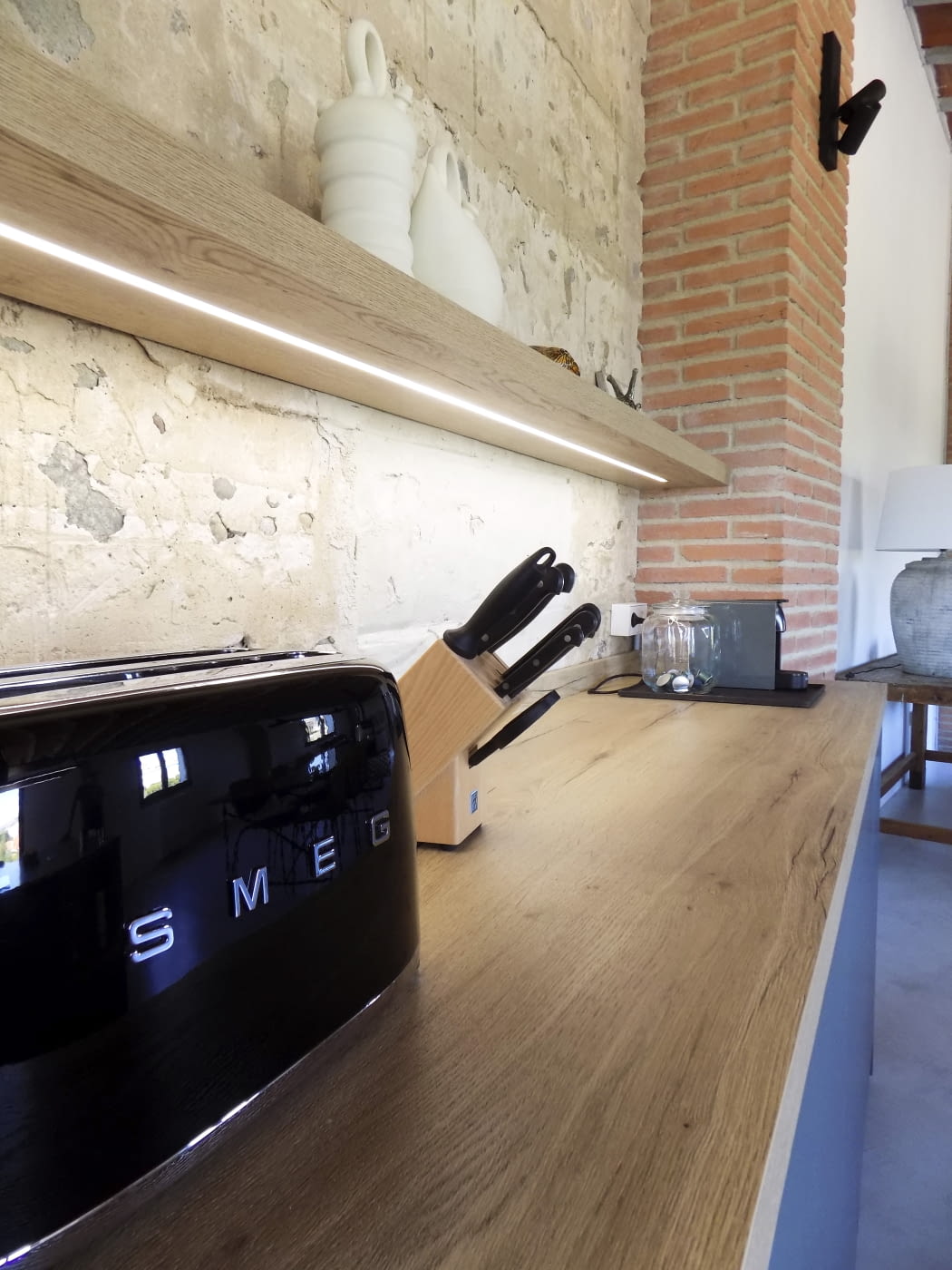 - Zona de columnas: Esta área incluye elementos esenciales para la cocina, como el combi integrado, el horno y el microondas, todos perfectamente alineados para optimizar el espacio vertical. También cuenta con una encimera de apoyo de madera, que aporta calidez y contrasta con la modernidad del color antracita de los muebles.