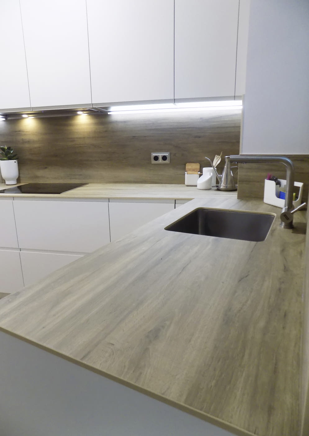 - Encimera en porcelánico Laminam Legno Venezia, con un acabado que imita la madera natural, combinando resistencia y calidez visual. Es ideal para soportar el uso intensivo del día a día y es fácil de mantener.