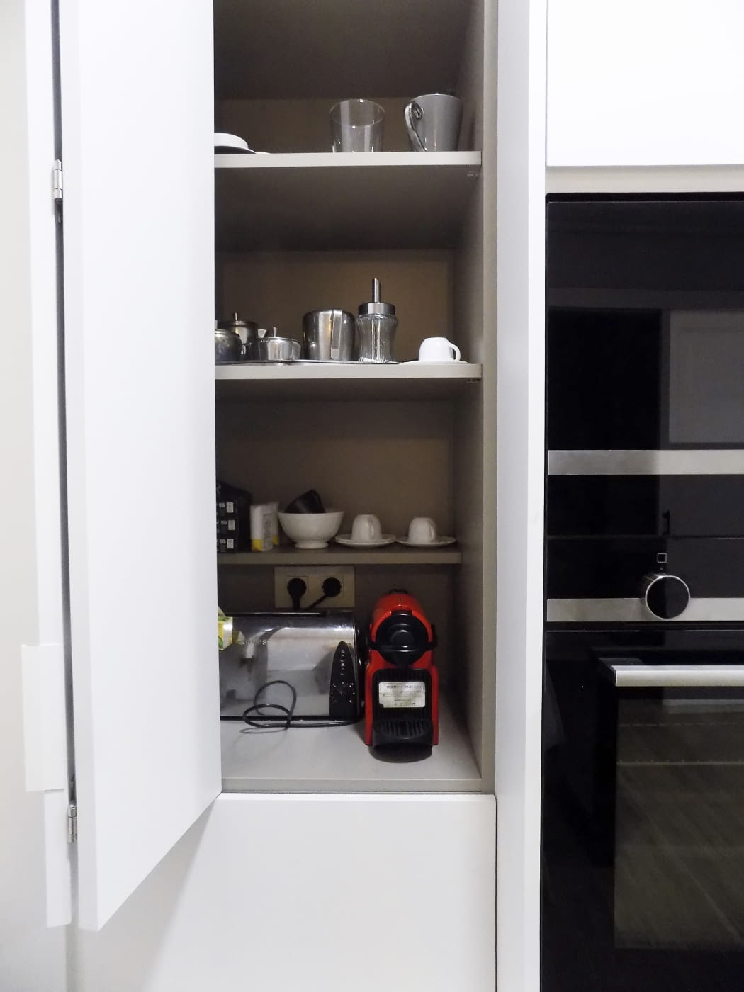 - Se ha integrado un espacio con dos puertas plegables para guardar y organizar el pequeño electrodoméstico. Esto facilita el acceso rápido y cómodo a aparatos como la cafetera, el robot de cocina o la tostadora, manteniendo la superficie de las encimeras libre de desorden.